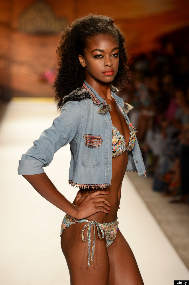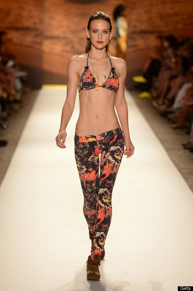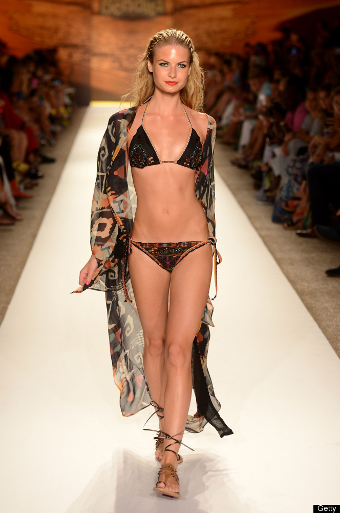 A grife de beachwear colombiana Água Bendita foi a primeira a desfilar para Mercedes Benz Fashion Week Swim Show. A coleção tem uma inspiração em estampas criativas, com animais, bem colorida, e para completar o desfile de maiôs, biquínis e saídas de praia, vestidos, os sapatos deixavam o calcanhar à mostra.