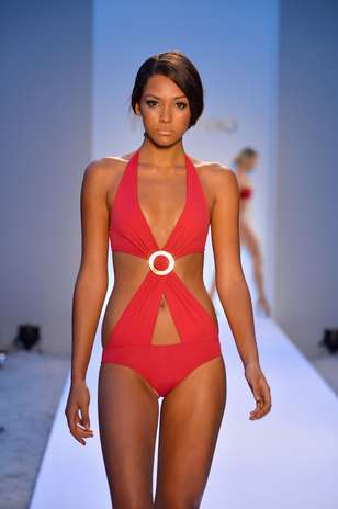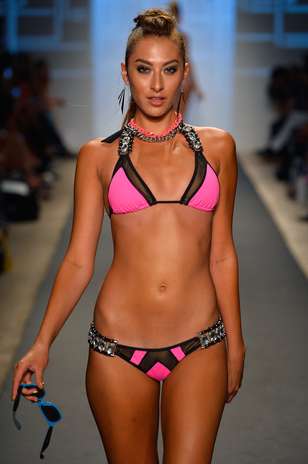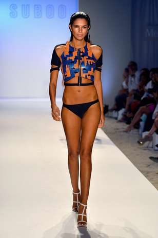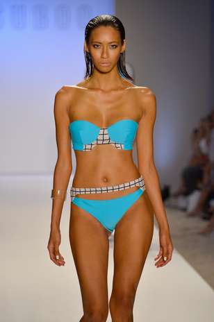 A grife apostou em biquínis com paetês e recortes bem quadriculados, cores vivas como o turquesa, o laranja, o azul escuro e o preto.